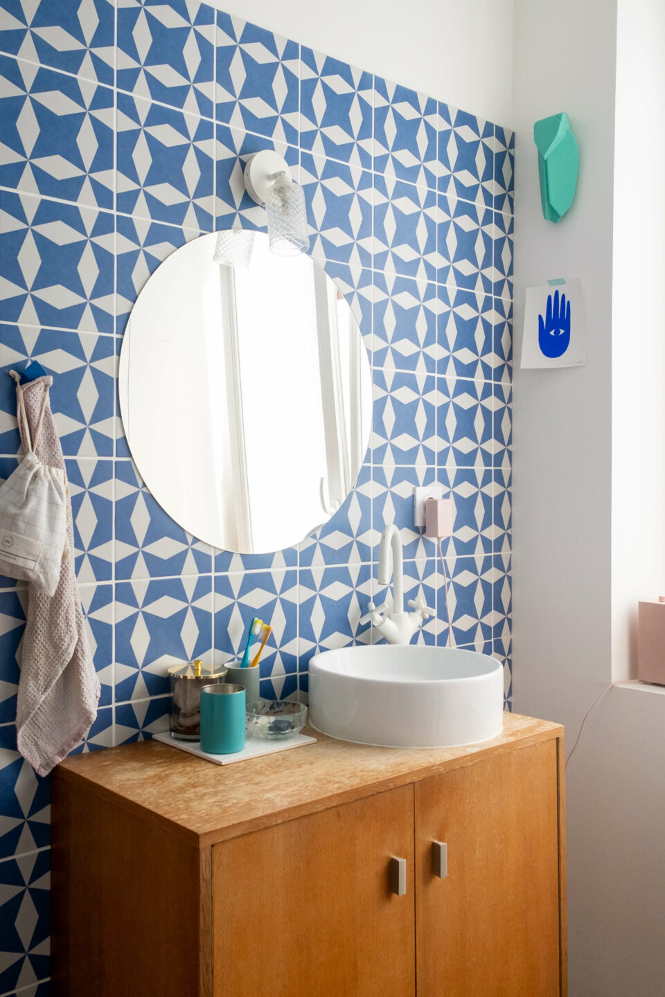 à droite : la salle de bain. Carrelage mural Leroy Merlin. Rideau Saskia Pomeroy – Urban Outfitters. Meuble chiné, vasque, robinet, applique, miroir Leroy Merlin.